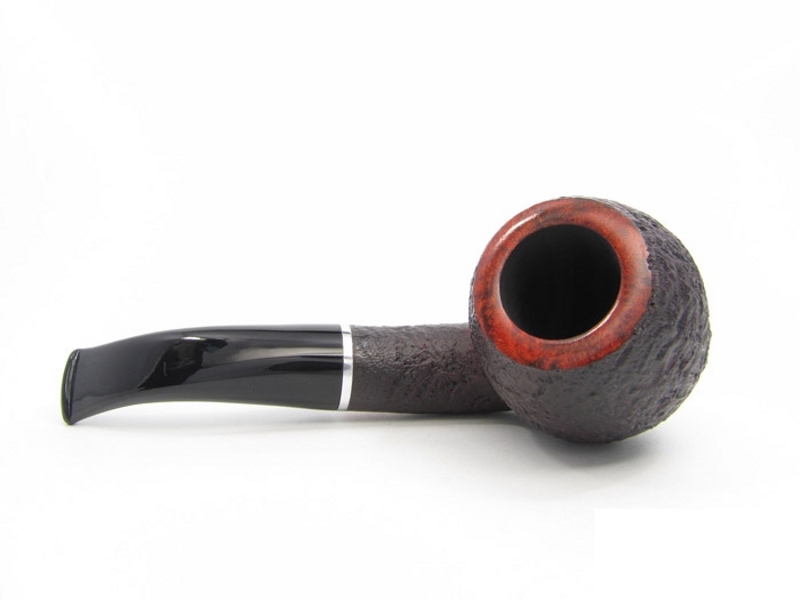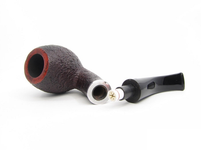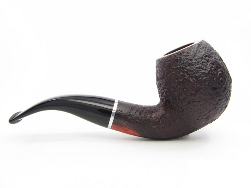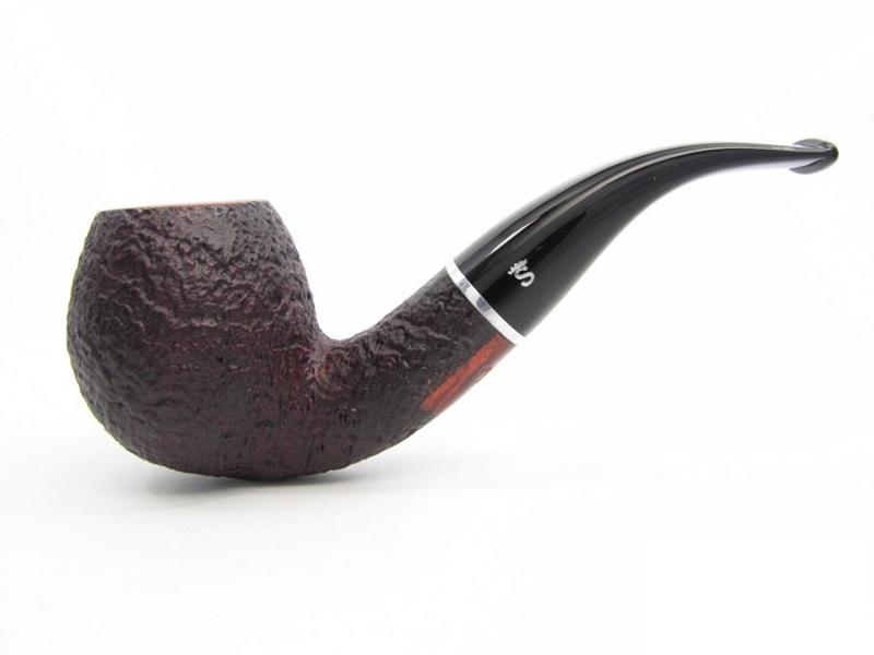 A Stanwell Relief 185 Black Sand pipa bruyerből készült homokfúvott fekete pipafej, 9mm-es filterrel, enyhén hajlított szárral, fekete akril szopókával. A szárat egy fémgyűrű díszíti