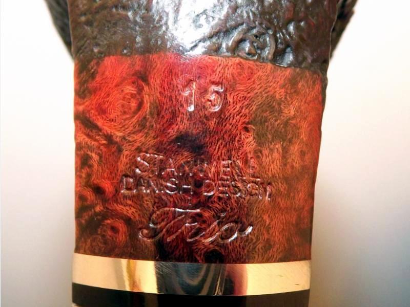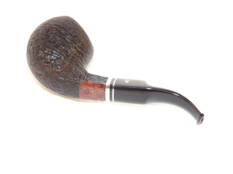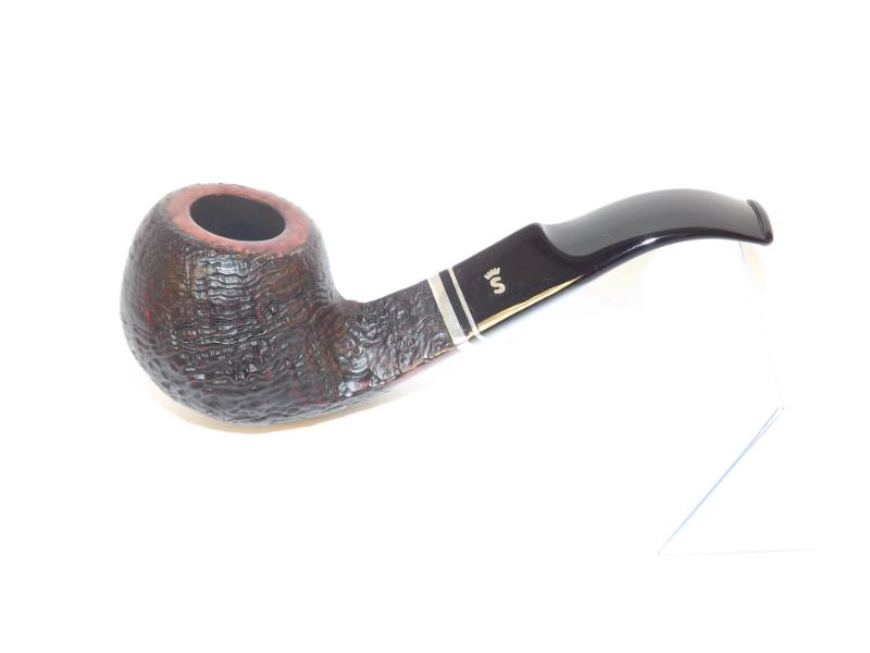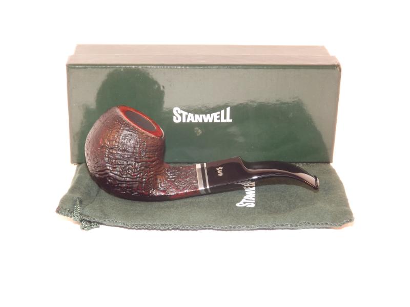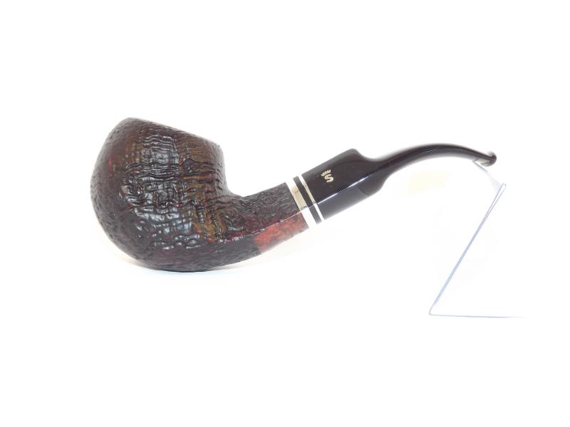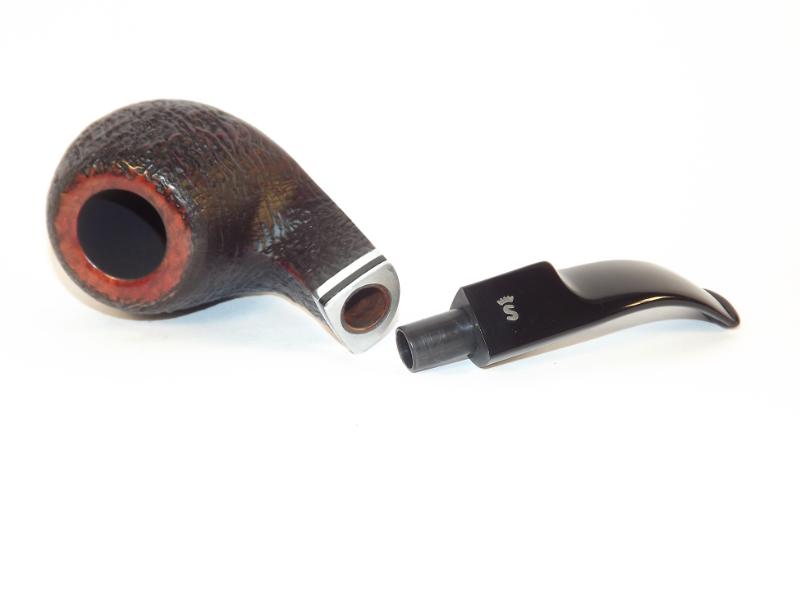 A Stanwell Trio 15 Black Sand pipa bruyerből készült homokfúvott, gömbölyű fekete pipafej, 9mm-es filterrel, hajlított, szögletes szárral, fekete, nyerges akril szopókával. A szárat két ezüst színű gyűrű között egy fekete akril gyűrű díszíti.